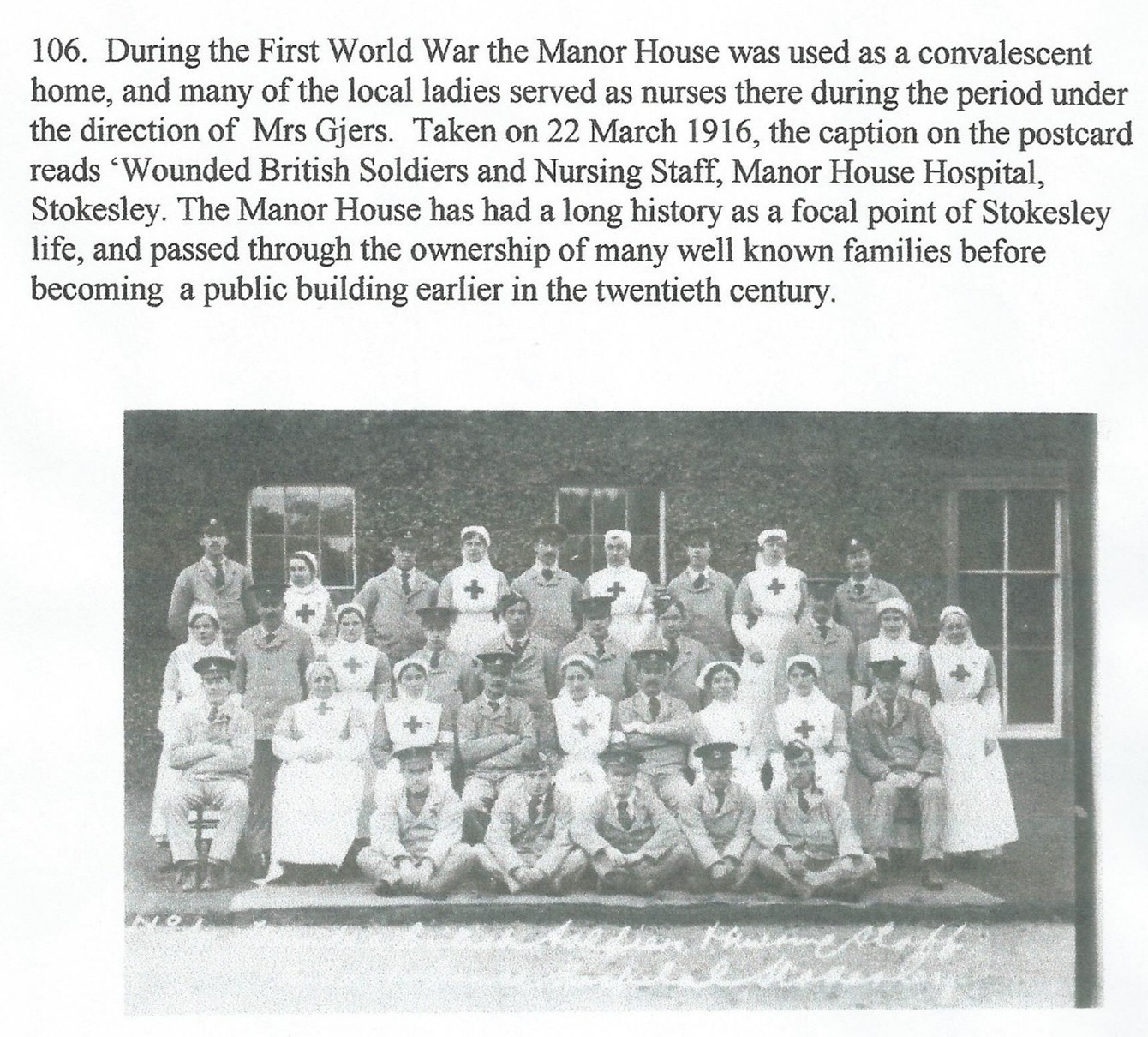 During World War I, the Manor House was given over to the service and care of wounded soldiers. Ann Gatenby Gjers of Busby Hall, was the wife of Lawrence Gjers, JP for Middlesbrough and the North Riding of Yorkshire, Colonel and Commandant of the North Riding National Reserve. Her father Issac Fidler was an alderman in Middlesbrough and had laid the foundation stone of Middlesbrough's new town hall on 24th October 1883 when he was Mayor.